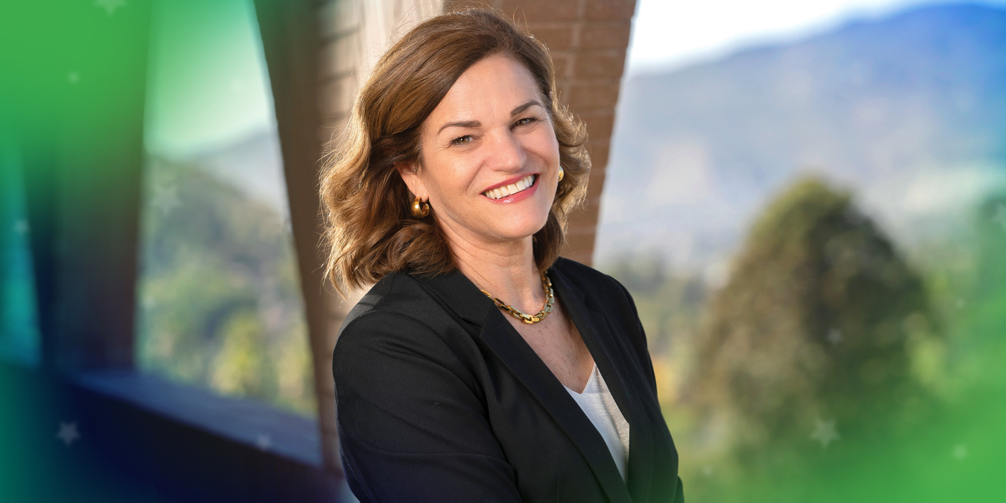 Riverside mayor and UCR alumna Patricia Lock Dawson smiles in front of a mountainous background